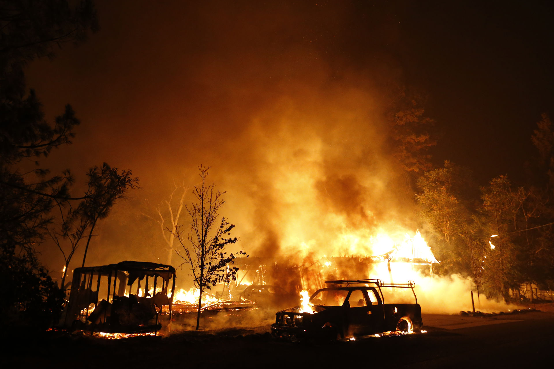 A car burns in front of a burning home. An estimated 13,000 people have had to evacuate because of the Valley Fire.